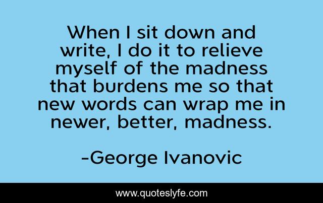 This page presents the quote "When I sit down and write, I do it to relieve myself of the madness that burdens me so that new words can wrap me in newer, better, madness.". Author of this quote is George Ivanovic. This quote is about books, madness, author, words, writing,.
