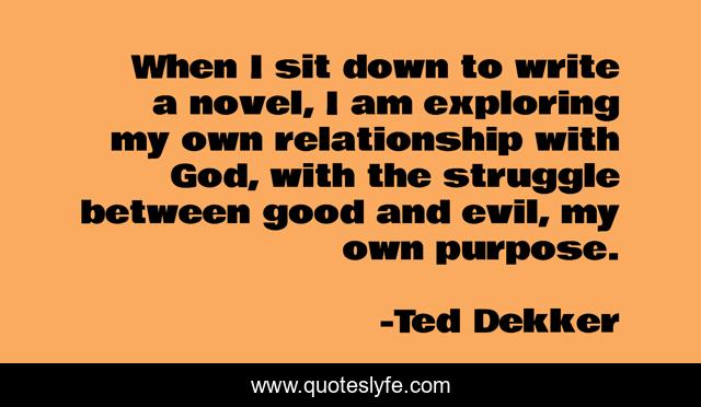 This page presents the quote "When I sit down to write a novel, I am exploring my own relationship with God, with the struggle between good and evil, my own purpose.". Author of this quote is Ted Dekker. This quote is about good, struggle, evil,.