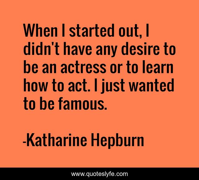 This page presents the quote "When I started out, I didn't have any desire to be an actress or to learn how to act. I just wanted to be famous.". Author of this quote is Katharine Hepburn. This quote is about desire, actress, learn,.