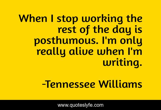 This page presents the quote "When I stop working the rest of the day is posthumous. I'm only really alive when I'm writing.". Author of this quote is Tennessee Williams. This quote is about tennessee-williams, writing,.