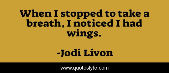 This page presents the quote "When I stopped to take a breath, I noticed I had wings.". Author of this quote is Jodi Livon. This quote is about intuition, medium, love, surviving, business, mystic, psychic, the-happy-medium, jodi-livon,.