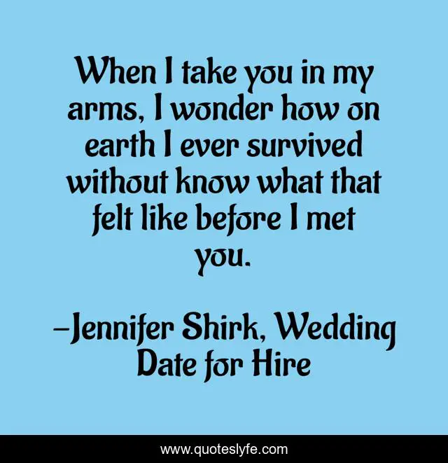 This page presents the quote "When I take you in my arms, I wonder how on earth I ever survived without know what that felt like before I met you.". Author of this quote is Jennifer Shirk, Wedding Date for Hire. .