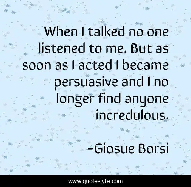 This page presents the quote "When I talked no one listened to me. But as soon as I acted I became persuasive and I no longer find anyone incredulous.". Author of this quote is Giosue Borsi. This quote is about going, getting,.