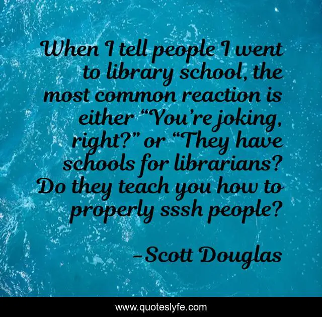 This page presents the quote "When I tell people I went to library school, the most common reaction is either “You’re joking, right?” or “They have schools for librarians? Do they teach you how to properly sssh people?". Author of this quote is Scott Douglas. This quote is about librarians, library-books, library, quiet-please,.