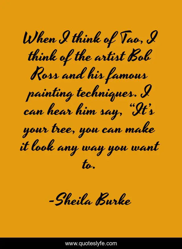 This page presents the quote "When I think of Tao, I think of the artist Bob Ross and his famous painting techniques. I can hear him say, “It’s your tree, you can make it look any way you want to.". Author of this quote is Sheila Burke. This quote is about spiritual-growth, life, strength, life-lessons, soul-searching, zen, motivation, zensational-living, soul,.
