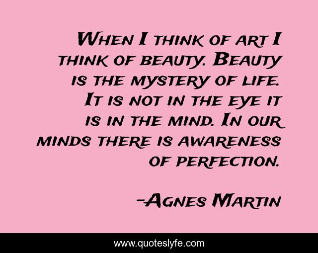 This page presents the quote "When I think of art I think of beauty. Beauty is the mystery of life. It is not in the eye it is in the mind. In our minds there is awareness of perfection.". Author of this quote is Agnes Martin. This quote is about mystery, life, art,.