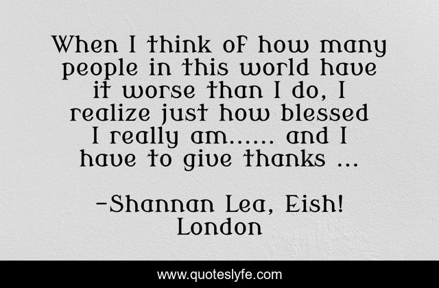 This page presents the quote "When I think of how many people in this world have it worse than I do, I realize just how blessed I really am...... and I have to give thanks ...". Author of this quote is Shannan Lea, Eish! London. This quote is about gratitude, blessings, blessed, thanks,.