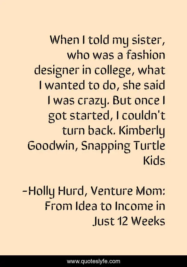 This page presents the quote "When I told my sister, who was a fashion designer in college, what I wanted to do, she said I was crazy. But once I got started, I couldn't turn back. Kimberly Goodwin, Snapping Turtle Kids". Author of this quote is Holly Hurd, Venture Mom: From Idea to Income in Just 12 Weeks. This quote is about entrepreneurs, entrepreneurship,.