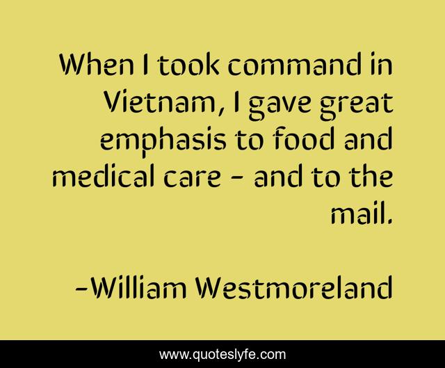 This page presents the quote "When I took command in Vietnam, I gave great emphasis to food and medical care - and to the mail.". Author of this quote is William Westmoreland. This quote is about food, great, care,.