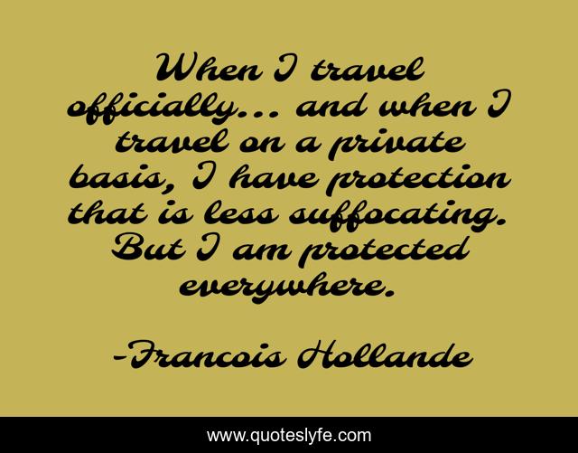 This page presents the quote "When I travel officially... and when I travel on a private basis, I have protection that is less suffocating. But I am protected everywhere.". Author of this quote is Francois Hollande. This quote is about protected, protection,.