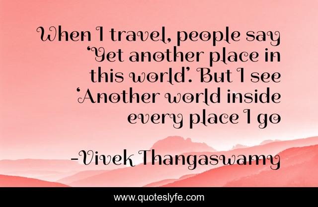 This page presents the quote "When I travel, people say ‘Yet another place in this world’. But I see ‘Another world inside every place I go". Author of this quote is Vivek Thangaswamy. This quote is about travel, backpacking, traveling-alone,.