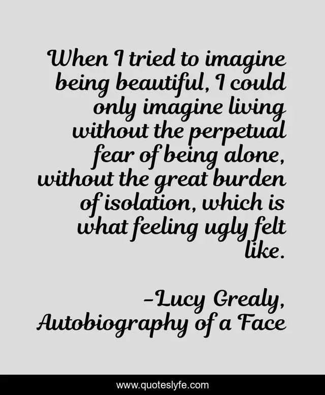 This page presents the quote "When I tried to imagine being beautiful, I could only imagine living without the perpetual fear of being alone, without the great burden of isolation, which is what feeling ugly felt like.". Author of this quote is Lucy Grealy, Autobiography of a Face. This quote is about isolation, suffering, beauty, ugly,.