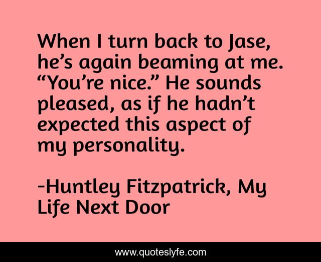 This page presents the quote "When I turn back to Jase, he’s again beaming at me. “You’re nice.” He sounds pleased, as if he hadn’t expected this aspect of my personality.". Author of this quote is Huntley Fitzpatrick, My Life Next Door. This quote is about funny, humour, young-adult-romance, romance, comedy, young-adult,.