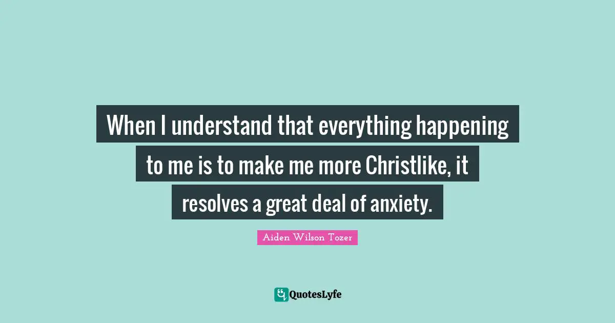 This page presents the quote "When I understand that everything happening to me is to make me more Christlike, it resolves a great deal of anxiety.". Author of this quote is Aiden Wilson Tozer. This quote is about jesus, christian, anxiety,.