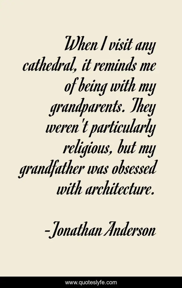 This page presents the quote "When I visit any cathedral, it reminds me of being with my grandparents. They weren't particularly religious, but my grandfather was obsessed with architecture.". Author of this quote is Jonathan Anderson. This quote is about me, grandparents,.