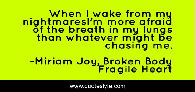This page presents the quote "When I wake from my nightmaresI’m more afraid of the breath in my lungs than whatever might be chasing me.". Author of this quote is Miriam Joy, Broken Body Fragile Heart. This quote is about self, poetry, identity,.