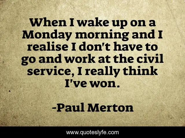 This page presents the quote "When I wake up on a Monday morning and I realise I don't have to go and work at the civil service, I really think I've won.". Author of this quote is Paul Merton. This quote is about wake up, work, service,.