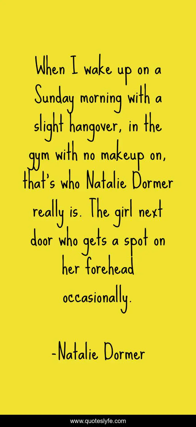 This page presents the quote "When I wake up on a Sunday morning with a slight hangover, in the gym with no makeup on, that's who Natalie Dormer really is. The girl next door who gets a spot on her forehead occasionally.". Author of this quote is Natalie Dormer. This quote is about girl, makeup, door,.
