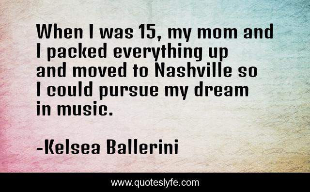 This page presents the quote "When I was 15, my mom and I packed everything up and moved to Nashville so I could pursue my dream in music.". Author of this quote is Kelsea Ballerini. This quote is about music, nashville, dream,.