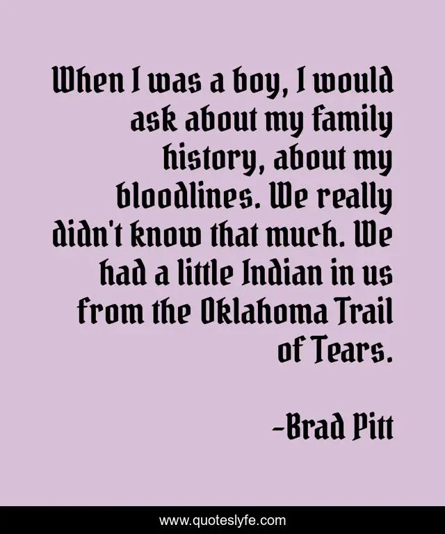 This page presents the quote "When I was a boy, I would ask about my family history, about my bloodlines. We really didn't know that much. We had a little Indian in us from the Oklahoma Trail of Tears.". Author of this quote is Brad Pitt. This quote is about tears, family,.