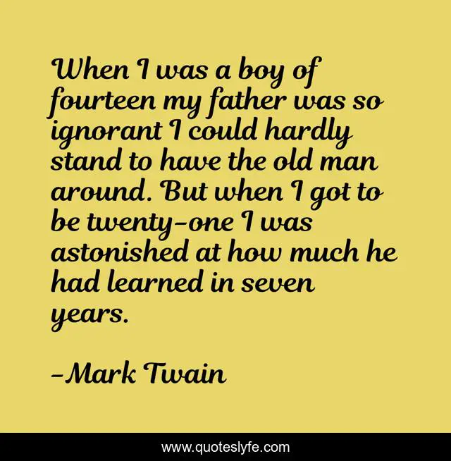 This page presents the quote "When I was a boy of fourteen my father was so ignorant I could hardly stand to have the old man around. But when I got to be twenty-one I was astonished at how much he had learned in seven years.". Author of this quote is Mark Twain. This quote is about fathers, mothers,.