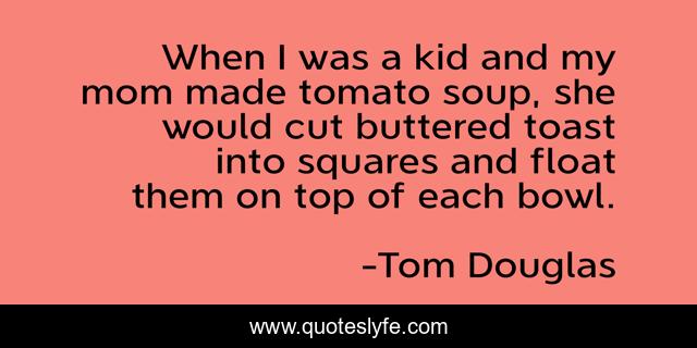 This page presents the quote "When I was a kid and my mom made tomato soup, she would cut buttered toast into squares and float them on top of each bowl.". Author of this quote is Tom Douglas. This quote is about soup, she, kid,.