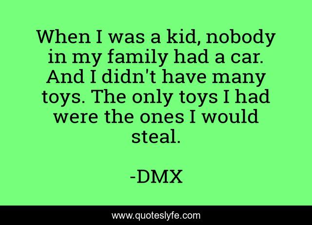 This page presents the quote "When I was a kid, nobody in my family had a car. And I didn't have many toys. The only toys I had were the ones I would steal.". Author of this quote is DMX. This quote is about nobody, family, toys,.