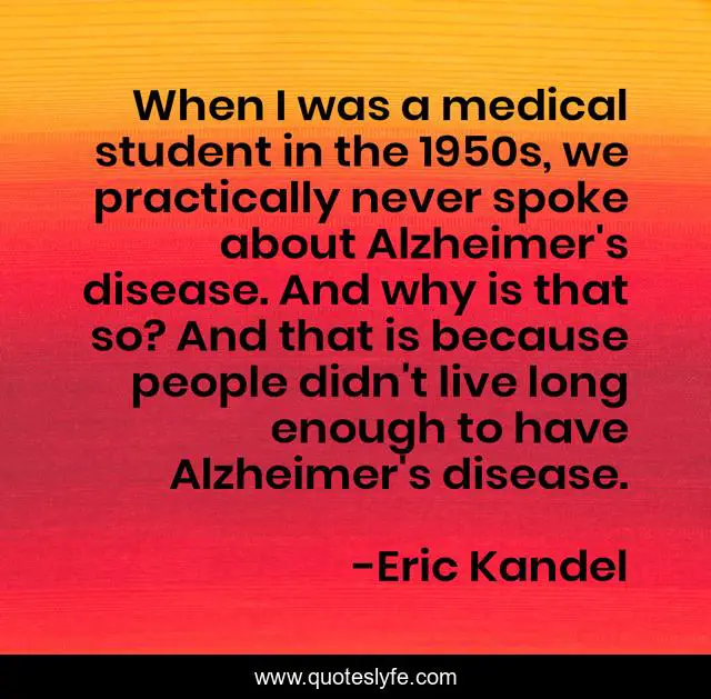 This page presents the quote "When I was a medical student in the 1950s, we practically never spoke about Alzheimer's disease. And why is that so? And that is because people didn't live long enough to have Alzheimer's disease.". Author of this quote is Eric Kandel. This quote is about live, long, people,.