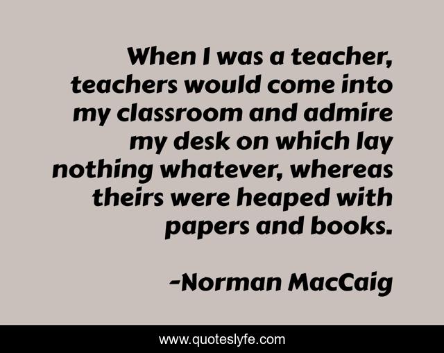 This page presents the quote "When I was a teacher, teachers would come into my classroom and admire my desk on which lay nothing whatever, whereas theirs were heaped with papers and books.". Author of this quote is Norman MacCaig. This quote is about admire, classroom, teachers,.