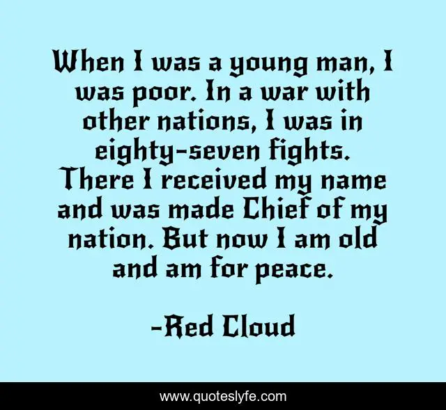 This page presents the quote "When I was a young man, I was poor. In a war with other nations, I was in eighty-seven fights. There I received my name and was made Chief of my nation. But now I am old and am for peace.". Author of this quote is Red Cloud. This quote is about peace, man,.