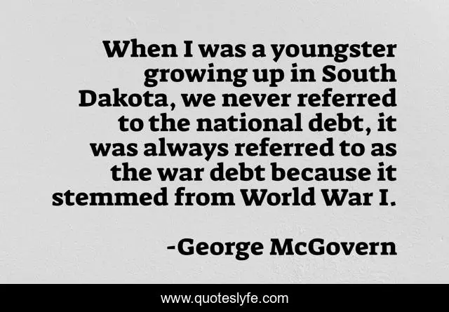 This page presents the quote "When I was a youngster growing up in South Dakota, we never referred to the national debt, it was always referred to as the war debt because it stemmed from World War I.". Author of this quote is George McGovern. This quote is about world, debt, growing up,.