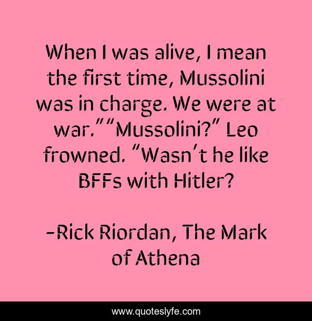 This page presents the quote "When I was alive, I mean the first time, Mussolini was in charge. We were at war.”“Mussolini?” Leo frowned. “Wasn’t he like BFFs with Hitler?". Author of this quote is Rick Riordan, The Mark of Athena. This quote is about funny, comedy, leo-valdez, lol, hazel-levesque,.