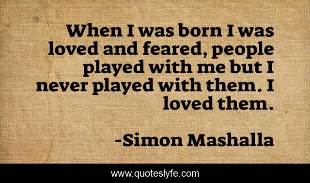 This page presents the quote "When I was born I was loved and feared, people played with me but I never played with them. I loved them.". Author of this quote is Simon Mashalla. This quote is about me, loved, them, people, born, feared,.