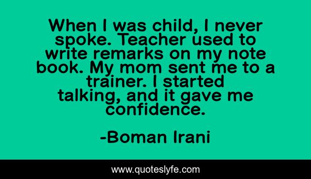 This page presents the quote "When I was child, I never spoke. Teacher used to write remarks on my note book. My mom sent me to a trainer. I started talking, and it gave me confidence.". Author of this quote is Boman Irani. This quote is about confidence, mom, child,.