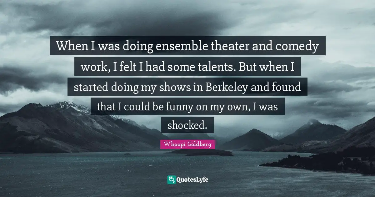 This page presents the quote "When I was doing ensemble theater and comedy work, I felt I had some talents. But when I started doing my shows in Berkeley and found that I could be funny on my own, I was shocked.". Author of this quote is Whoopi Goldberg. This quote is about comedy, funny, found, theater, shocked, ensemble, my own, berkeley, talent,.