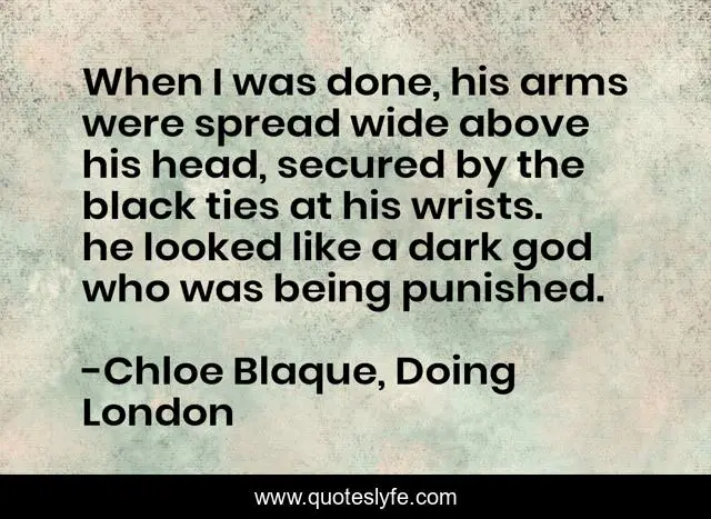 This page presents the quote "When I was done, his arms were spread wide above his head, secured by the black ties at his wrists. he looked like a dark god who was being punished.". Author of this quote is Chloe Blaque, Doing London. This quote is about erotic-romance, romance-novels,.