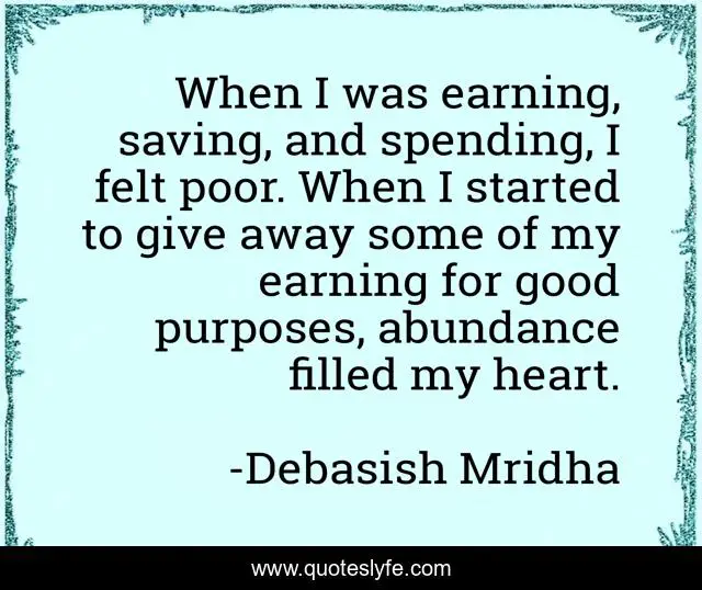 This page presents the quote "When I was earning, saving, and spending, I felt poor. When I started to give away some of my earning for good purposes, abundance filled my heart.". Author of this quote is Debasish Mridha. This quote is about good-purposes, give-to-others, philosophy, debasish-mridha, i-felt-poor, quotes, debasish-mridha-md, inspirational, enthusiasm,.