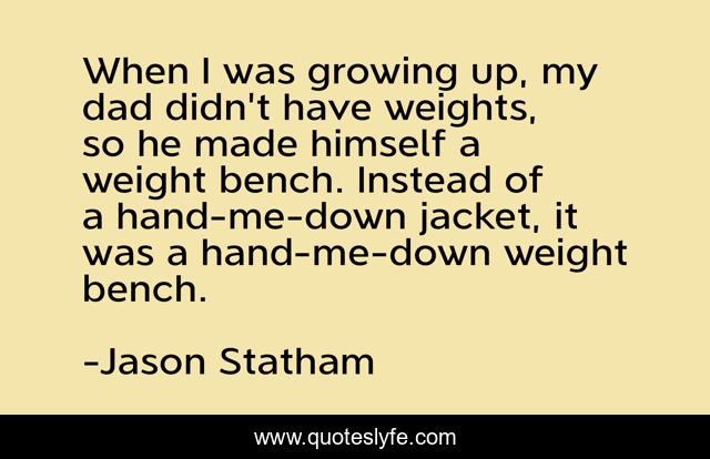 This page presents the quote "When I was growing up, my dad didn't have weights, so he made himself a weight bench. Instead of a hand-me-down jacket, it was a hand-me-down weight bench.". Author of this quote is Jason Statham. This quote is about growing, growing up, bench,.