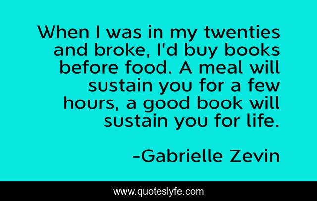 This page presents the quote "When I was in my twenties and broke, I'd buy books before food. A meal will sustain you for a few hours, a good book will sustain you for life.". Author of this quote is Gabrielle Zevin. This quote is about books, reading,.