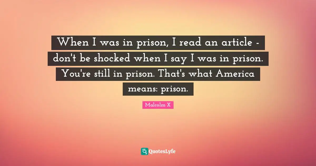 This page presents the quote "When I was in prison, I read an article - don't be shocked when I say I was in prison. You're still in prison. That's what America means: prison.". Author of this quote is Malcolm X. This quote is about prison, shocked, america, mean, powerful,.