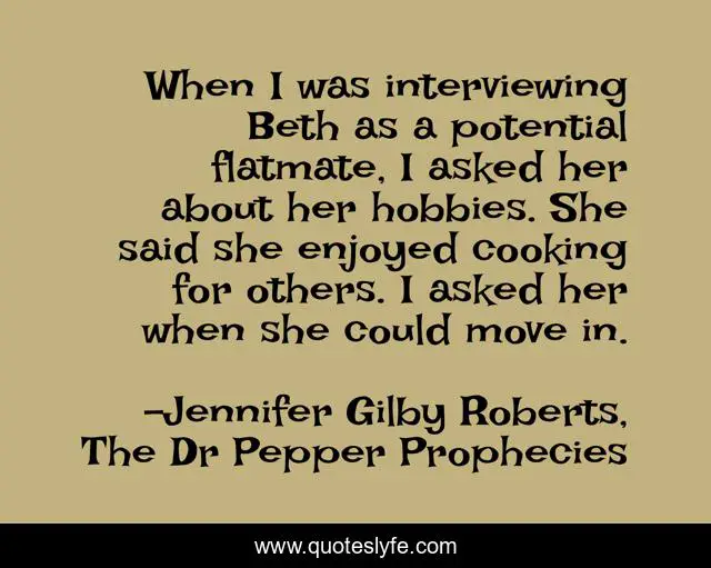 "Jennifer Gilby Roberts, The Dr Pepper Prophecies Quotes." Quoteslyfe.com, 2025. Fri. 05 Dec. 2025. <https://www.quoteslyfe.com/quote/When-I-was-interviewing-Beth-as-a-168314>.