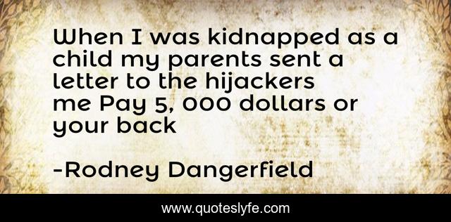 This page presents the quote "When I was kidnapped as a child my parents sent a letter to the hijackers me Pay 5, 000 dollars or your back". Author of this quote is Rodney Dangerfield. This quote is about funny, humor, humour, rodney-dangerfield, child, kiddnapped, comedy,.