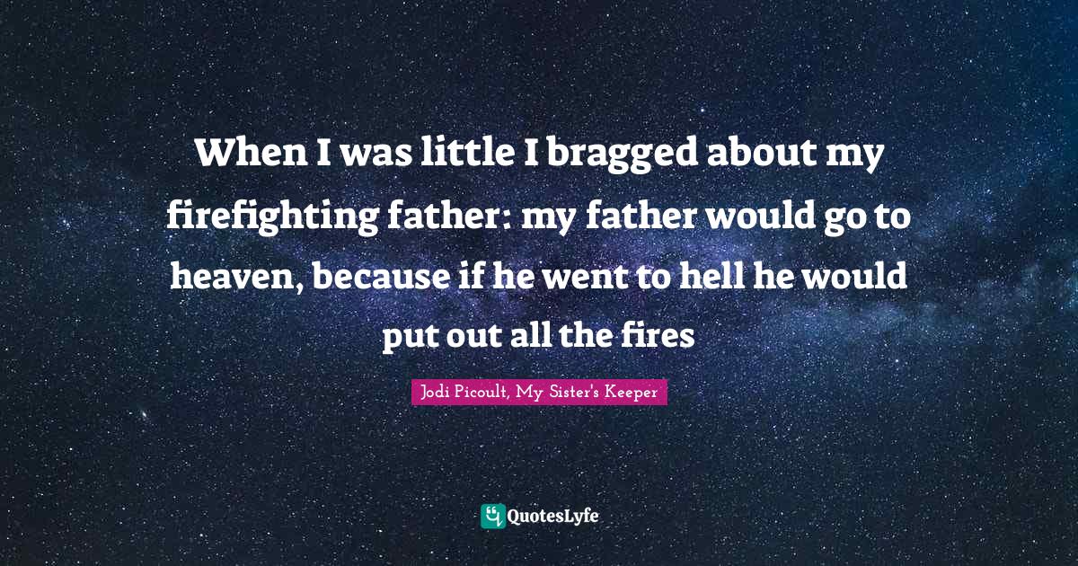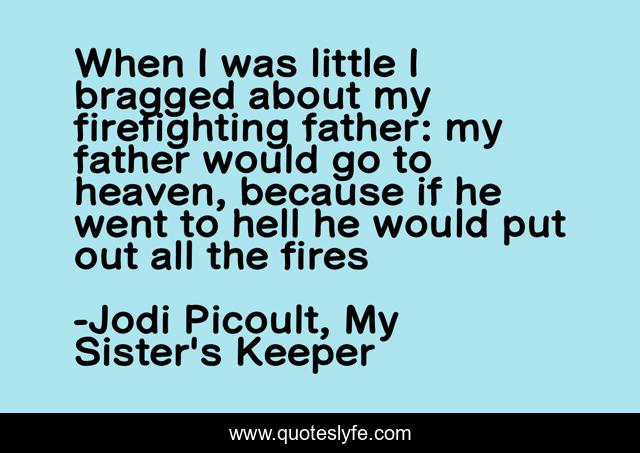 This page presents the quote "When I was little I bragged about my firefighting father: my father would go to heaven, because if he went to hell he would put out all the fires". Author of this quote is Jodi Picoult, My Sister's Keeper. This quote is about heaven, humor, firefighting, brian-fitzgerald, father, hell, kate-fitzgerald,.