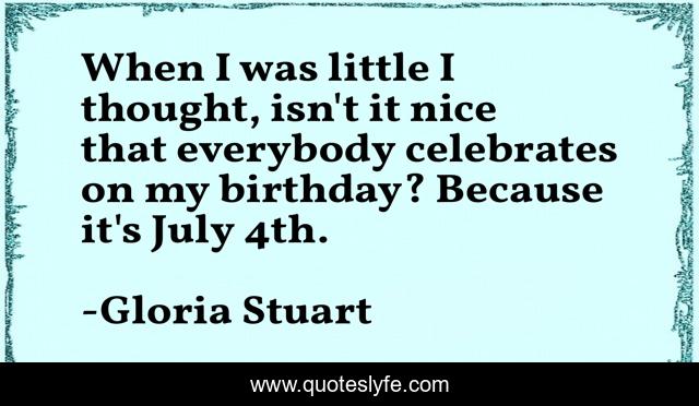 This page presents the quote "When I was little I thought, isn't it nice that everybody celebrates on my birthday? Because it's July 4th.". Author of this quote is Gloria Stuart. This quote is about thought, little, nice,.
