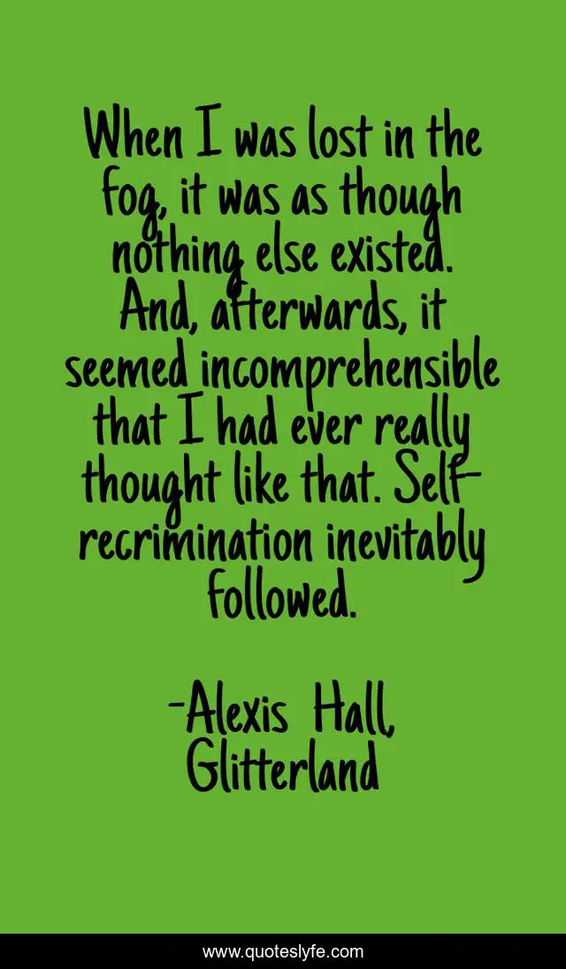This page presents the quote "When I was lost in the fog, it was as though nothing else existed. And, afterwards, it seemed incomprehensible that I had ever really thought like that. Self-recrimination inevitably followed.". Author of this quote is Alexis Hall, Glitterland. This quote is about self-recrimination, bipolar, fog, depression,.