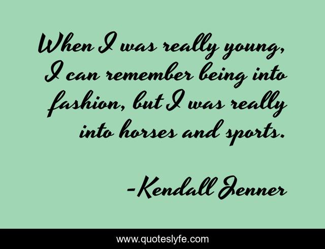 This page presents the quote "When I was really young, I can remember being into fashion, but I was really into horses and sports.". Author of this quote is Kendall Jenner. This quote is about fashion, remember, young,.