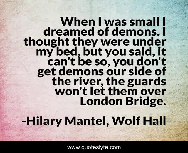 This page presents the quote "When I was small I dreamed of demons. I thought they were under my bed, but you said, it can't be so, you don't get demons our side of the river, the guards won't let them over London Bridge.". Author of this quote is Hilary Mantel, Wolf Hall. This quote is about funny, demons, nightmares, fear, comedy, dreams,.