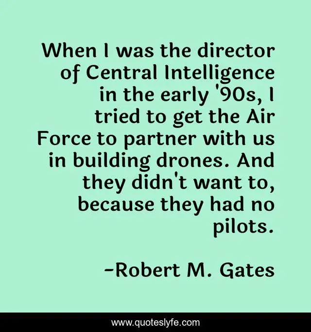 This page presents the quote "When I was the director of Central Intelligence in the early '90s, I tried to get the Air Force to partner with us in building drones. And they didn't want to, because they had no pilots.". Author of this quote is Robert M. Gates. This quote is about building, partner,.