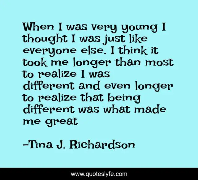 This page presents the quote "When I was very young I thought I was just like everyone else. I think it took me longer than most to realize I was different and even longer to realize that being different was what made me great". Author of this quote is Tina J. Richardson. This quote is about different, unique, autism,.