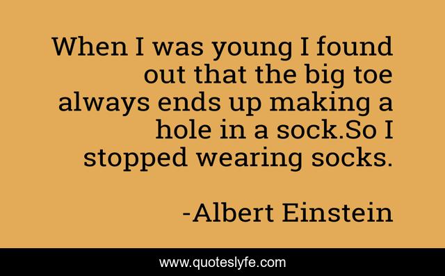 This page presents the quote "When I was young I found out that the big toe always ends up making a hole in a sock.So I stopped wearing socks.". Author of this quote is Albert Einstein. This quote is about funny, humor, socks, einstein, comedy, toe,.
